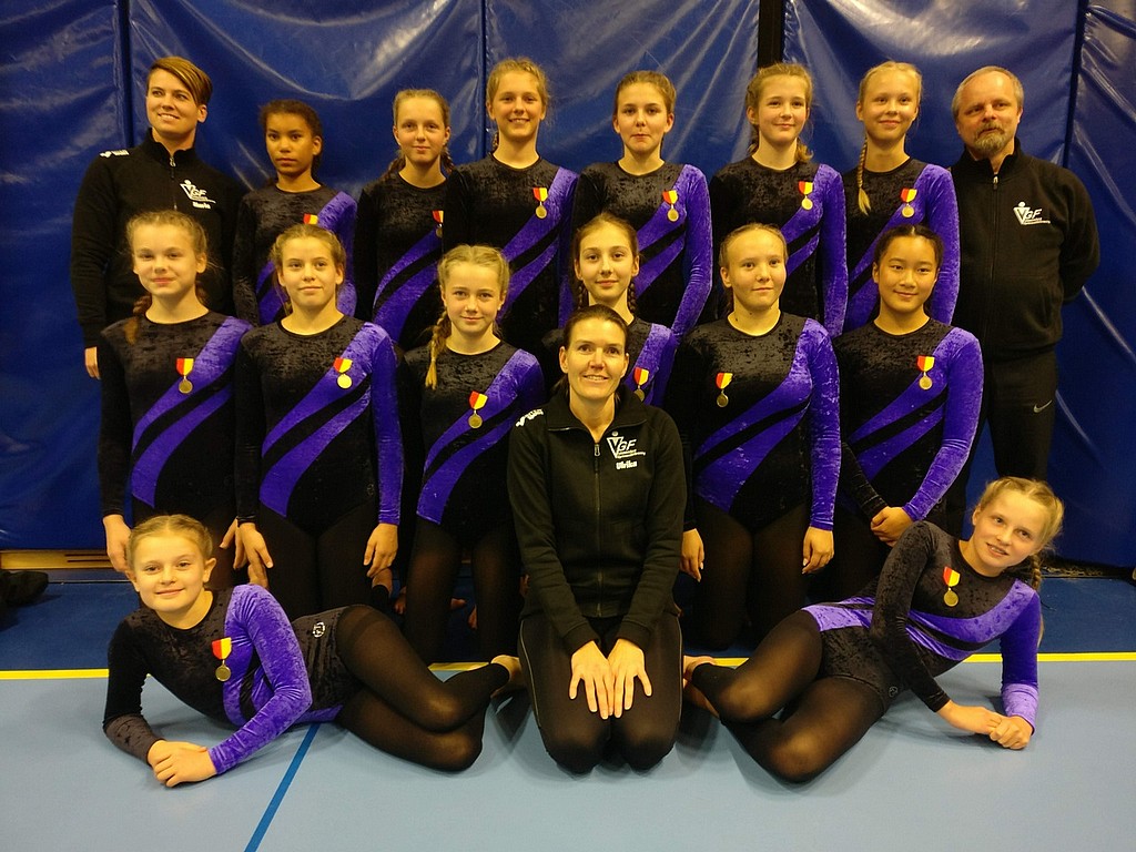 Efter en lite stressig förträning i trampett taggade tjejerna till och gjorde sitt allra bästa, vilket ledde till en fin tredje plats. Totalt ca 30 lag tävlade i grencuperna i Klippan idag. Tjejerna tävlade även i tumblinggolv, vilket också gick jättebra. Härligt glada och stolta gymnaster och ledare. Stort GRATTIS!!